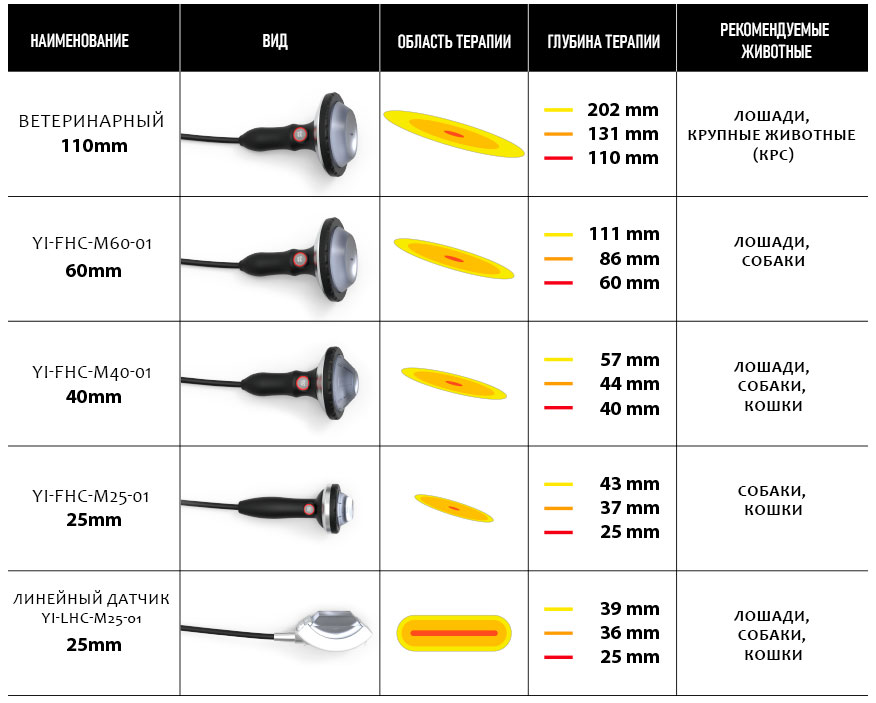 В ветеринарии используются источники терапии с фокусным расстоянием от 25 до 110 мм (центральная глубина проникновения) и максимальной дистальной глубиной от 39 до 202 мм. Лечение ударно-волновой терапией можно оптимизировать, просто подобрав нужный источник, чтобы точно достать до зоны интереса.