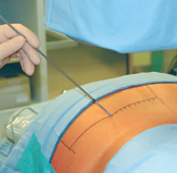 Доступ определяется под контролем ЭОП и с учетом патологии на основании атомических ориентиров в передне-заднем ходе луча. Он должен проходить как можно более медиально в интерламинарном окне, что бы облегчить вход под расположенным наискось дугоотросчатым суставом в латеральном направлении.